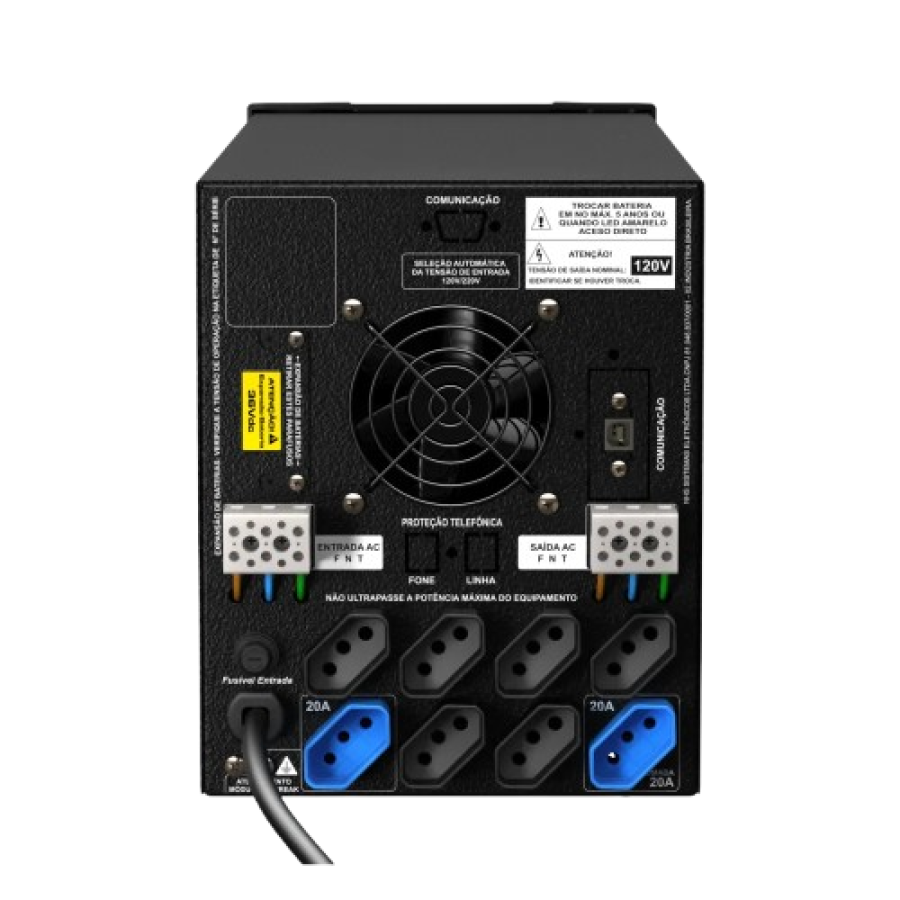 » Proteções: -Contra sobrecarga e curto-circuito nas tomadas de saída; -Contra sub e sobretensão da rede elétrica; -Contra sub e sobrefrequência da rede elétrica; -Contra descarga profunda e sobrecarga da bateria; -Contra sobreaquecimento no inversor. -Contra surtos da rede elétrica e descarga atmosférica.